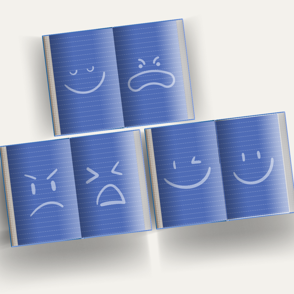 A digital notebook with a bold blue background and playful white emojis on every page.